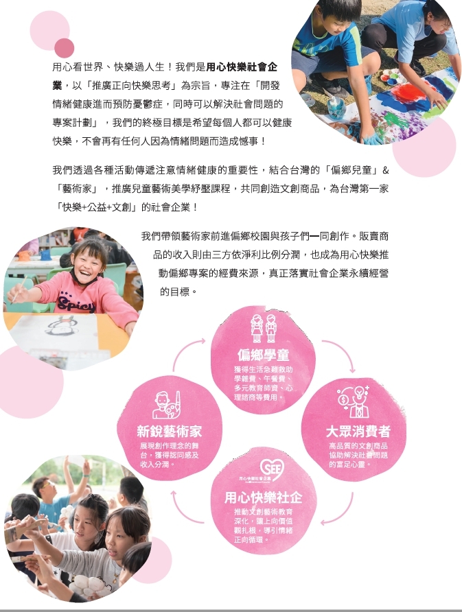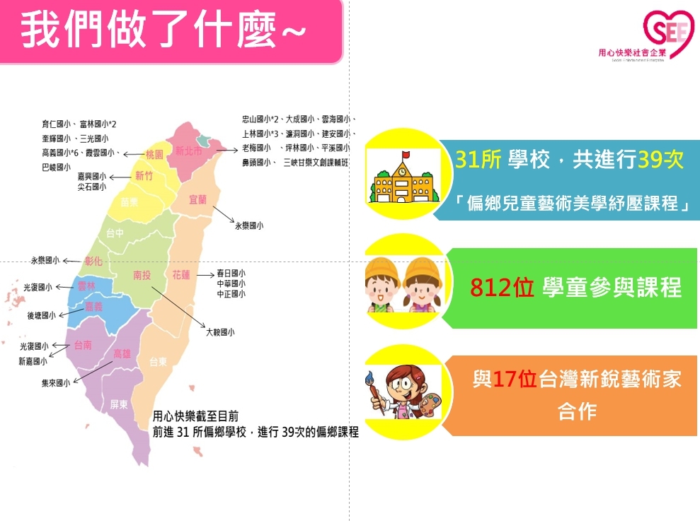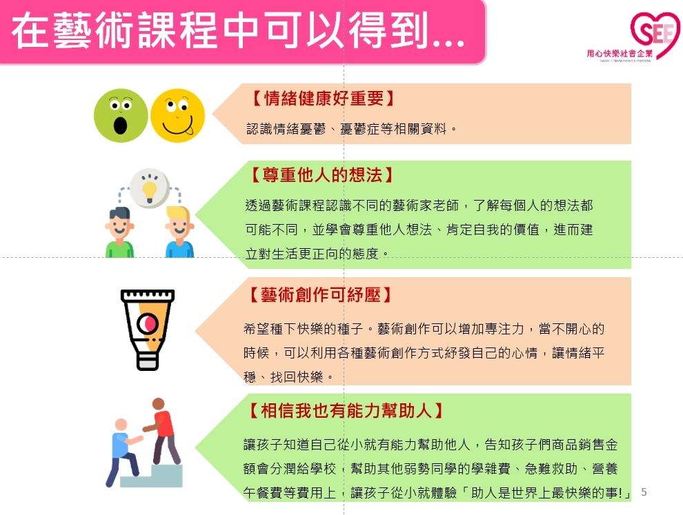 我們前進台灣各地偏鄉小學,進行情緒教育課程,教導孩子正確的疏壓方式,從認識情緒開始,進而認識憂鬱症,了解情緒不健康時可自我調整情緒方法及求助管道。同時邀請「新銳藝術家」,教導孩子用藝術創作紓壓,並透過兒童豐富的創作力與藝術家共同創作具有當地特色的畫作。​
