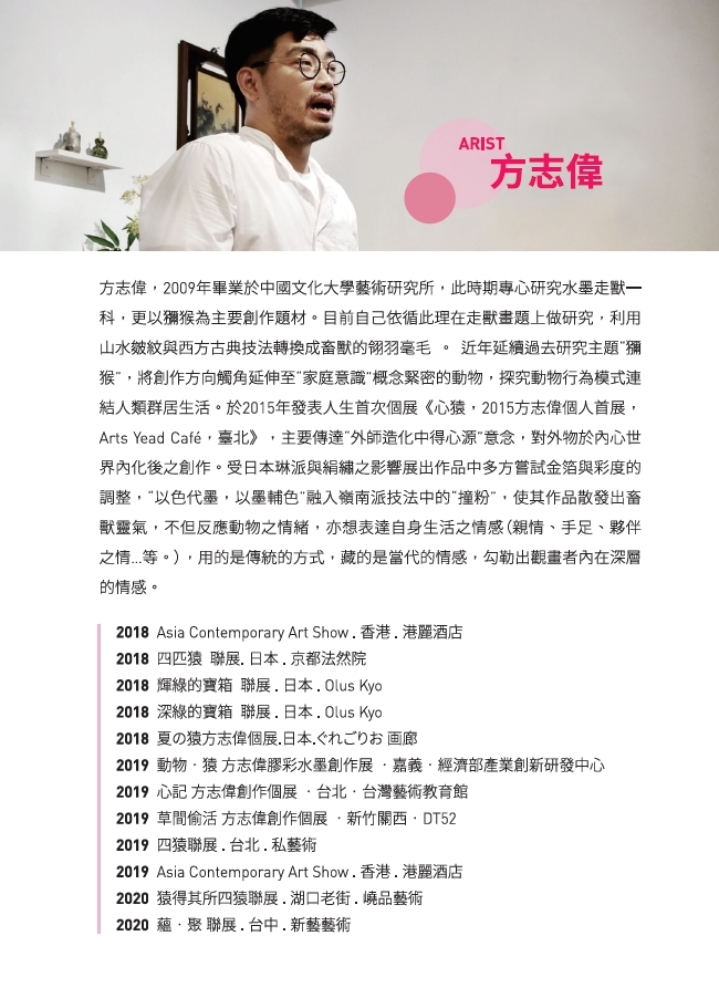 藝術家方志偉受日本琳派與絹繡之影響,作品中多方嘗試金箔與彩度的調整,“以色代墨,以墨輔色”融入嶺南派技法中的“撞粉”,使其作品散發出畜獸靈氣,不但反應動物之情緒,亦想表達自身生活之情感(親情`手足`夥伴之情…等。)