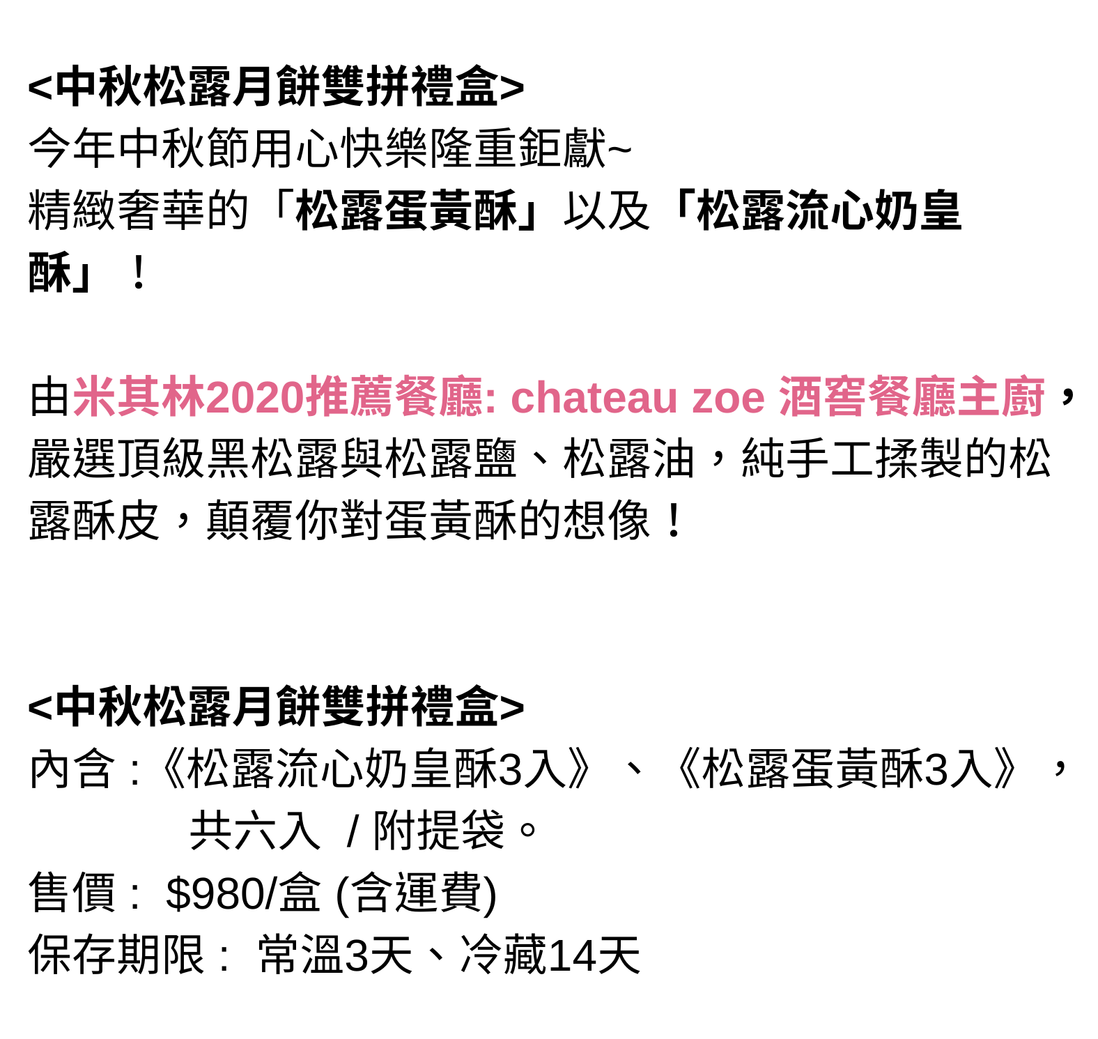 用心快樂與" 米其林推薦餐廳 zoe "聯手合作<中秋松露月餅雙拼禮盒> : 精緻奢華的「松露蛋黃酥」以及「松露流心奶皇酥」!