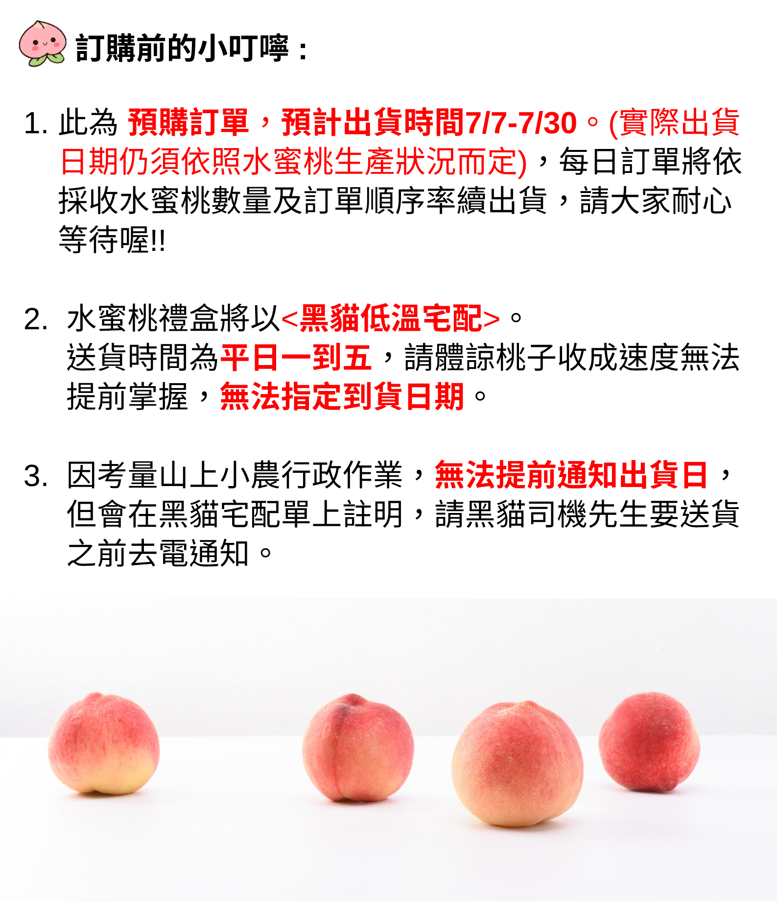 📦 出貨日期|7月7日起依訂單順序陸續出貨,7月30日前全數送達 (因配合桃子自然生長狀態,無法指定到貨日期)