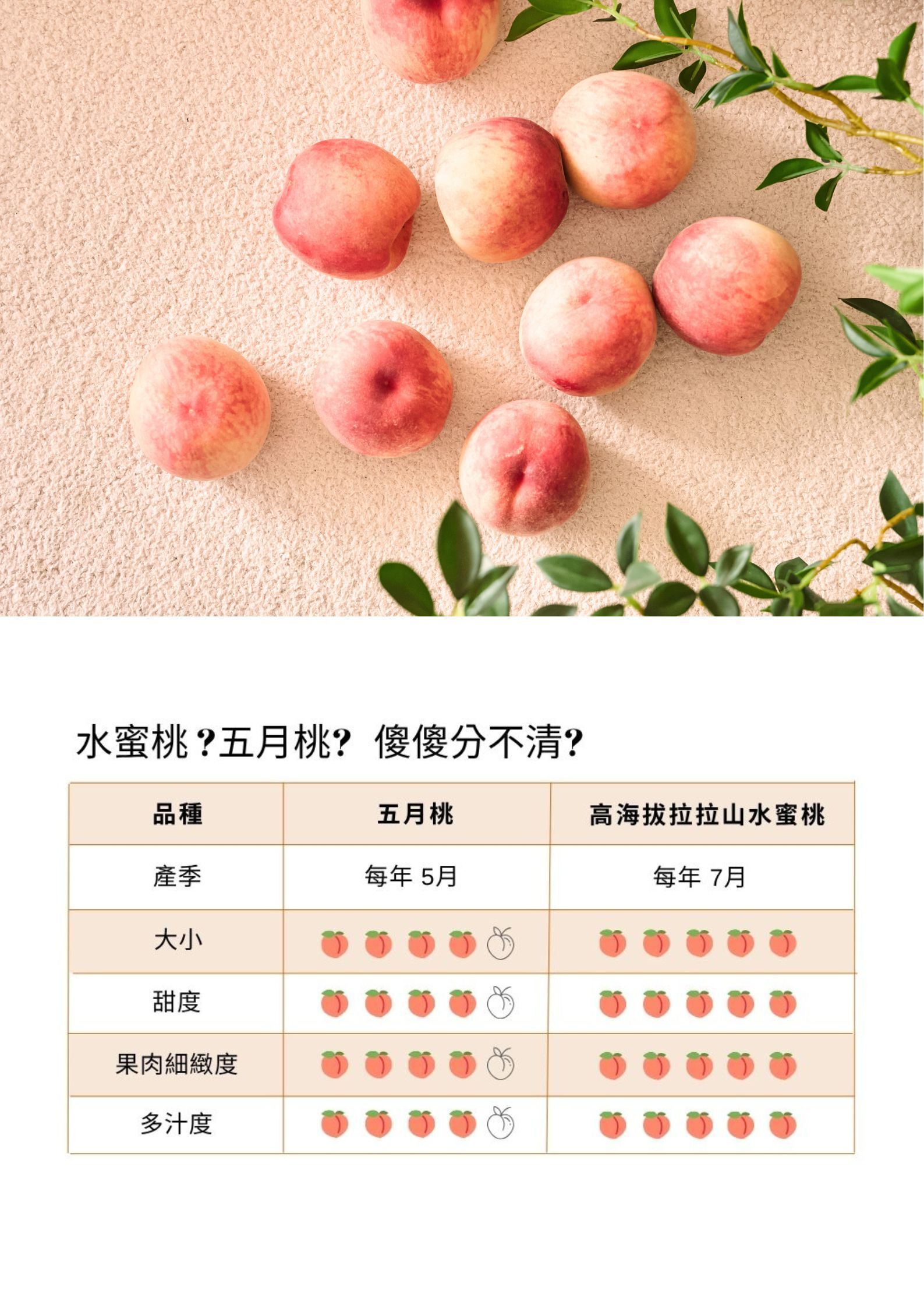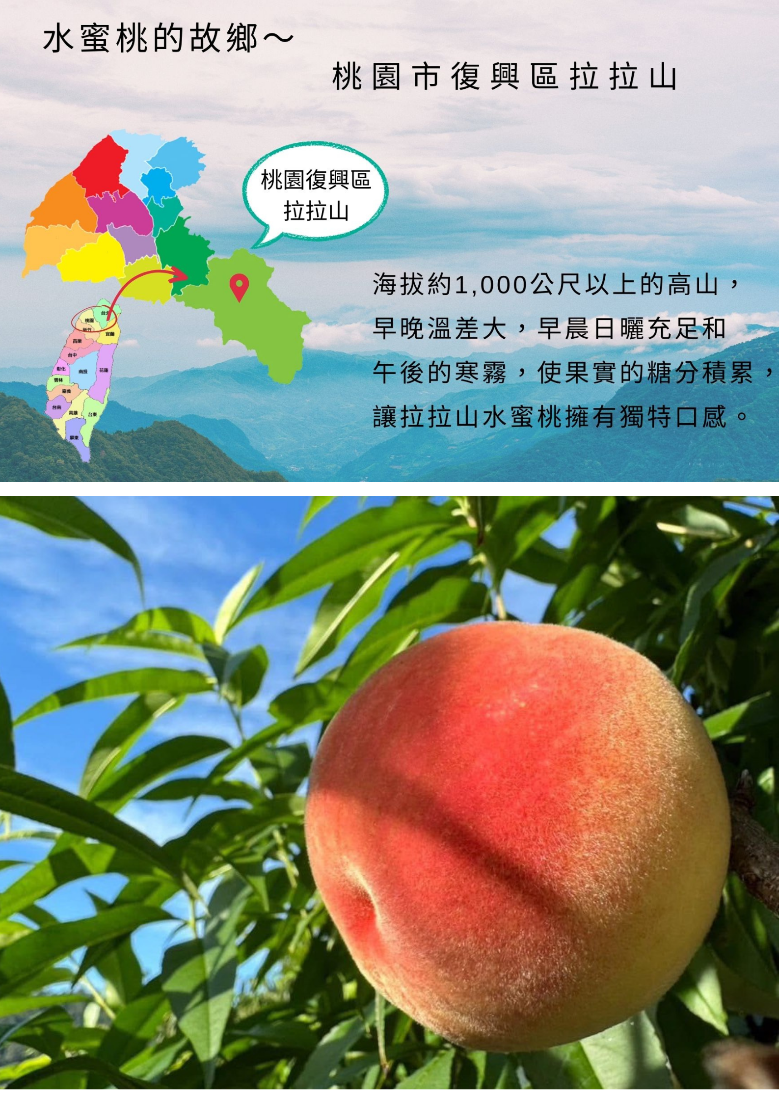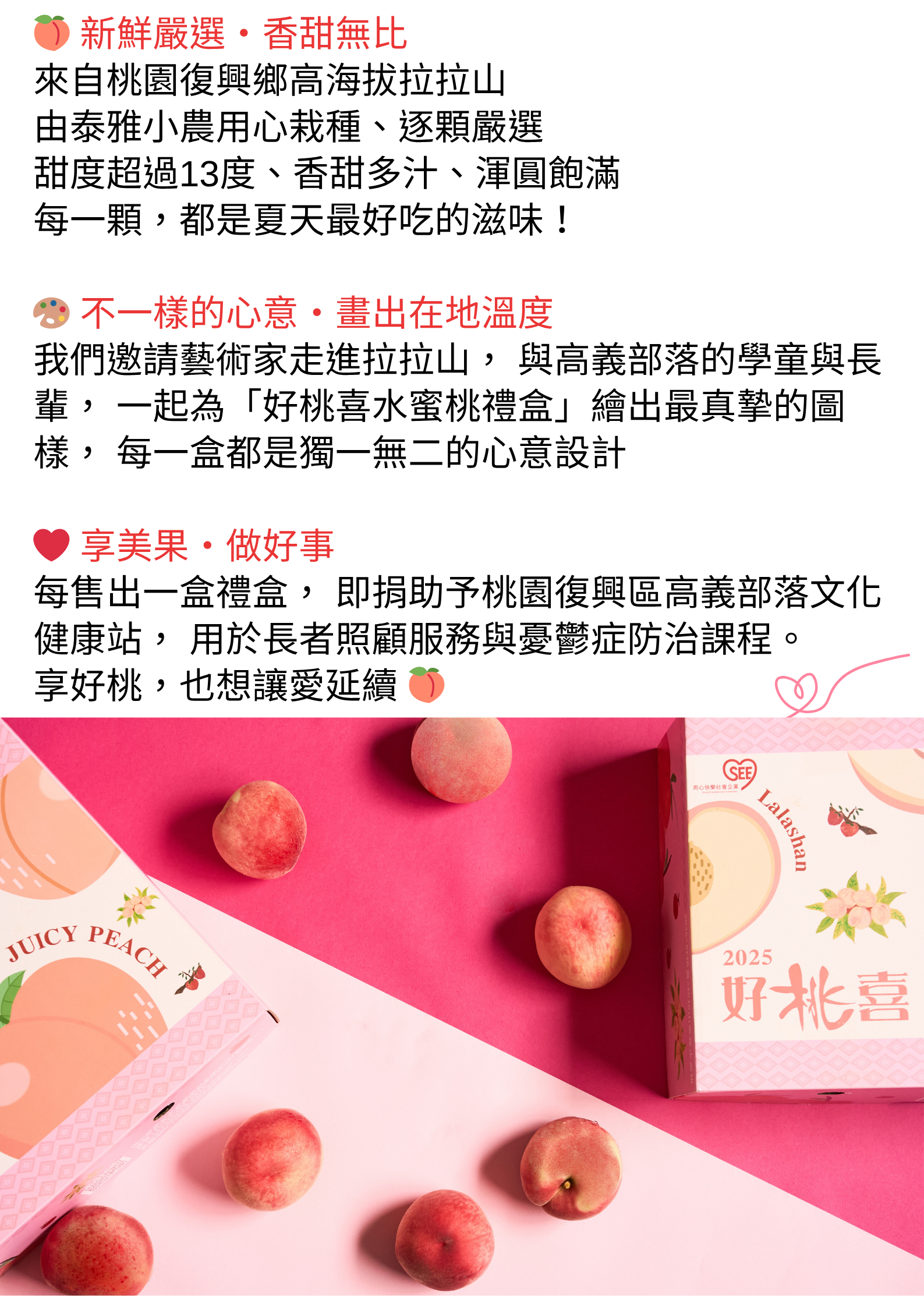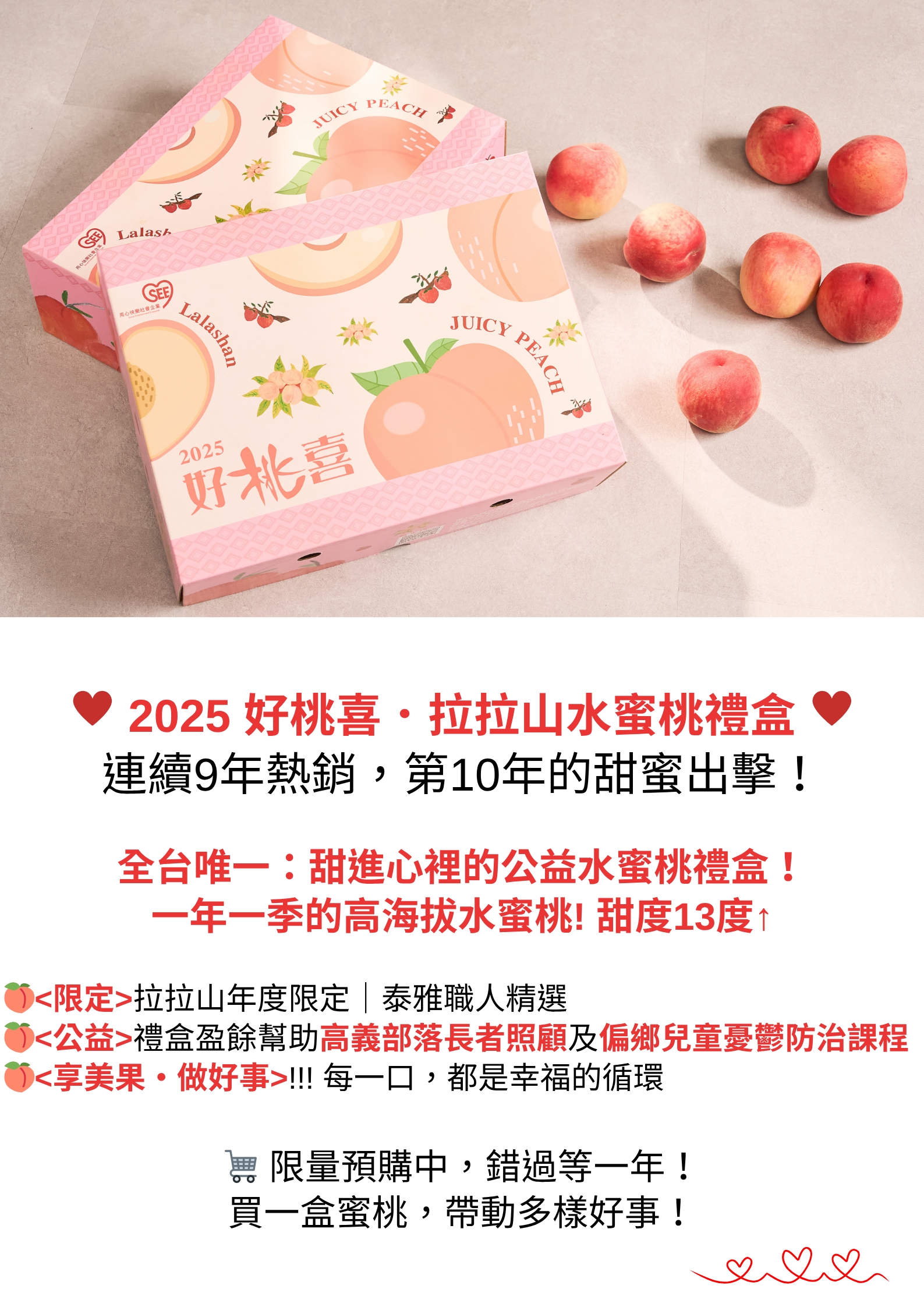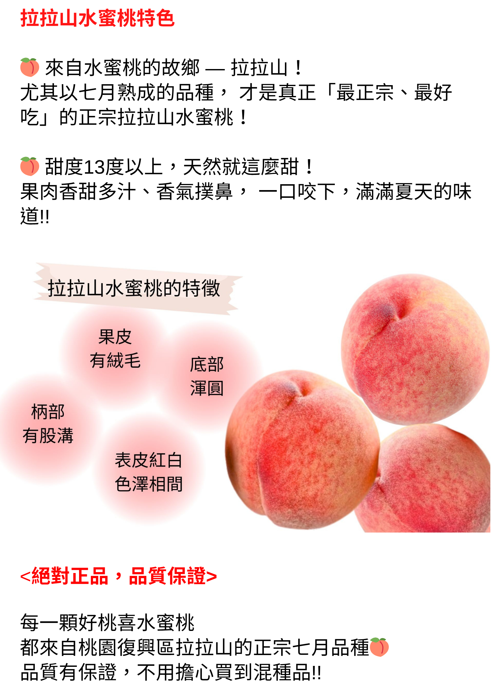 嚴選 #拉拉山海拔1000公尺以上 的珍稀美果,限時限量,<好桃喜>只賣七月的正宗拉拉山水蜜桃!因為最正宗,果肉最細緻、最香甜,每顆水蜜桃都是渾圓飽滿、甜蜜多汁,甜度超過13度,是夏季最不能錯過的幸福滋味!