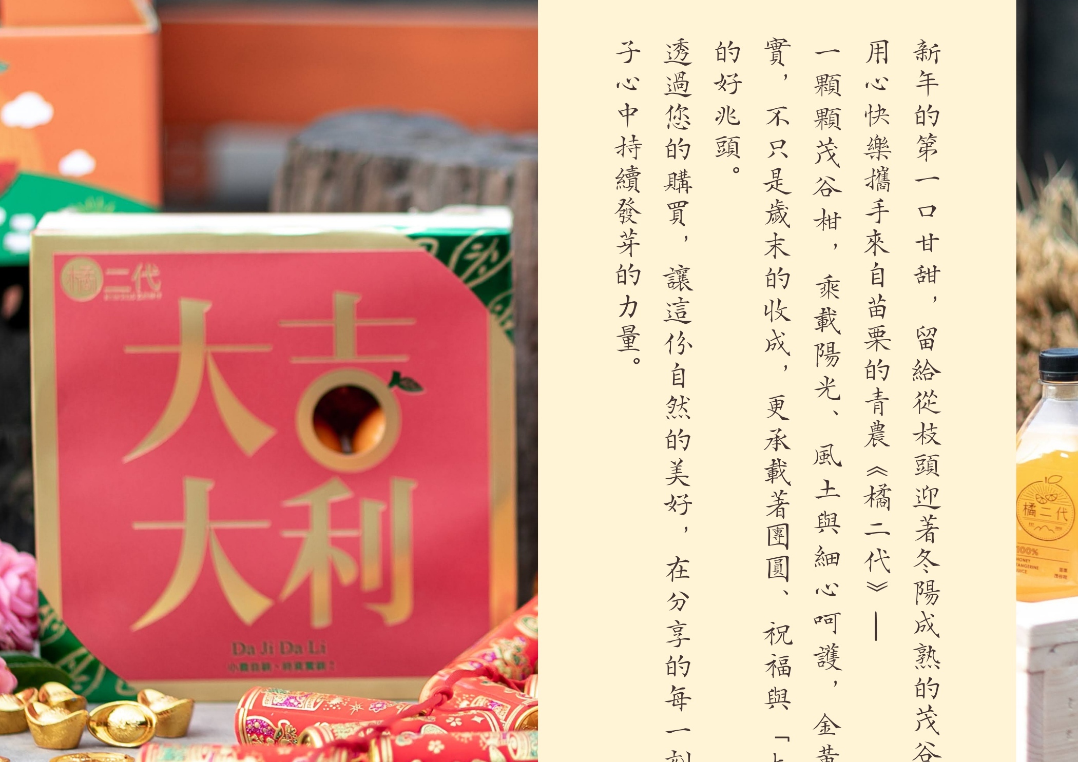 用心快樂與來自苗栗大湖的返鄉青農品牌<橘二代>合作,推出【大吉大利春節茂谷柑禮盒】🍊