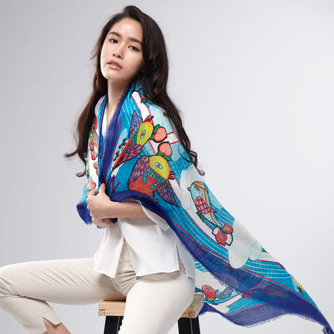 設計理念:插畫家王子麵指導奎輝國小孩童手繪泰雅族神鳥,再經由服裝設計師呂學政編排設計而成。圍巾披肩兩用的披巾選用使用皇家御用的100%純天然美麗諾羊毛,更具柔和魅力。頂級的材質、充滿童趣又不失時尚品味的圖樣,是一年四季適用的亮眼時尚單品。世界和平是一切美好事物的基礎,海闊天空意境搭配小朋友多樣性的手繪,呼應著世界多元不分種族、國界、性別與屬於全人類該共同關心維護的意涵。